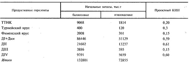 Основные начальные запасы нефти приурочены к терригенной толще девона (96,8%). В свою очередь, 70% запасов было сконцентрировано в ДІ. Запасы горизонтов ДIII и ДIV практически выработаны.