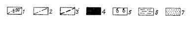 1-изогипсы по кровле XIVпласта, 2- контуры: а- газоносности XIV пласта, б- нефтеносности, 3- разрывы, 4- нефть, 5- газ, 6- глинистые, 7- песчаные породы