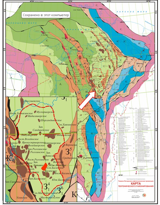 Рис. 2 Карта тектонического районирования Тимано-Печорской нефтегазоносной провинции (красным пунктиром оконтурено Сандивейское поднятие)