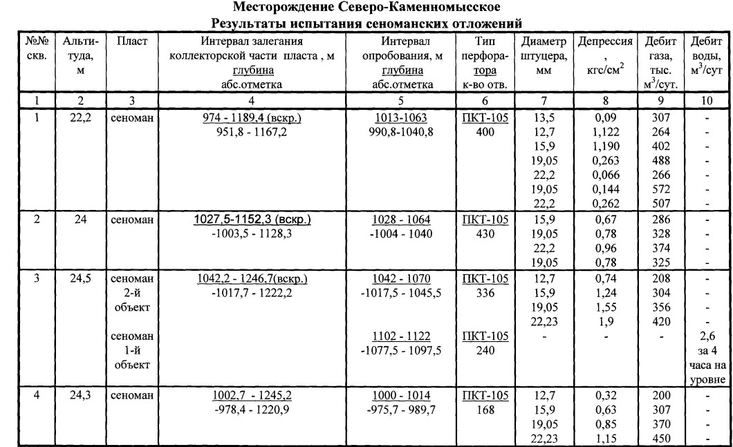 Результаты опробования скважин месторождения СевероКаменномысское приводятся в таблице 1.
