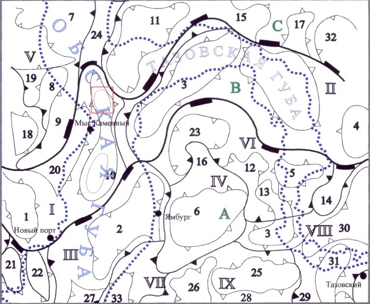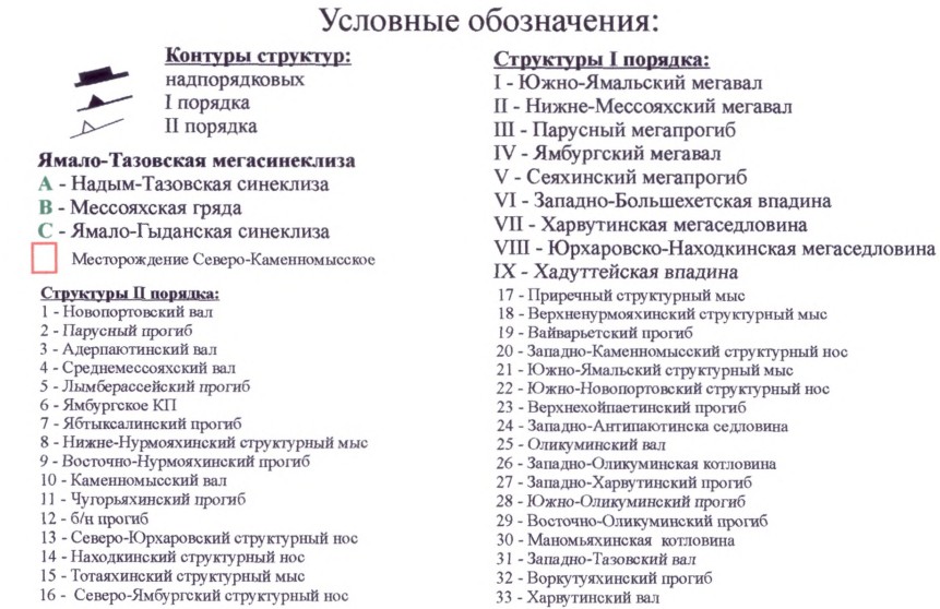 В тектоническом отношении месторождение связано с субмеридианальным Каменномысским валом, расположенным под акваторией Обской губы и приурочено к локальной антиклинальной складке, осложняющей северную часть этого вала (рис. 1).