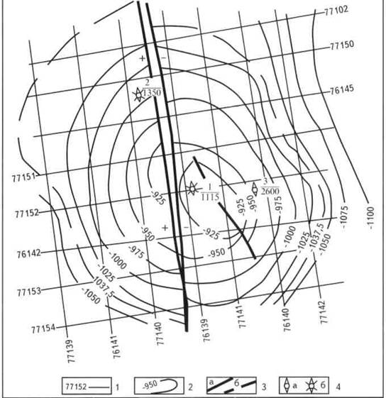 Рис. 1. Структурная карта по кровле верхнего майкопа Северо-Казантипского газоконденсатного месторождения. 1 - сейсмические профили; 2 - изогипсы отражающего горизонта IA, м; 3 - тектоническое нарушение: а - установленное, 6 - предполагаемое; 4 - скважина: а - проектная поисковая, б - поисковая, подлежащая ликвидации (числитель - номер скважины, знаменатель - глубина).