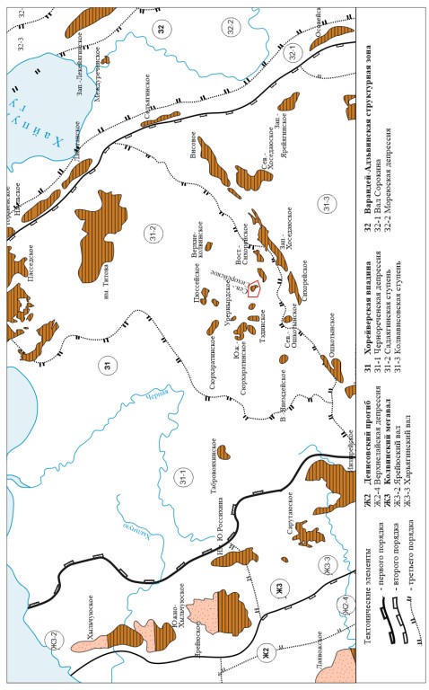 По подошве триасовых отложений черты ступенчатого строения Хорейверской впадины нивелируются, приобретая облик пологой моноклинали, осложненной структурными носами, террасами и малоамплитудными (не более 50 м) локальными поднятиями. Все месторождения поднятия выделяются в составе группы биогермных структур девонского возраста, которые образовались на границе двух тектонических элементов – Колвависовской и Садаягинской ступеней.