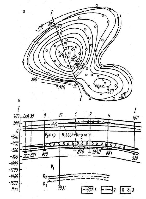 Рис. 1. Северо-Ставропольско-Пелагиадинское газовое месторождение (по А.А. Аввакумову): а — структурная карта по кровле продуктивного хадумского горизонта; б — геологический разрез: 1 — изогипсы, м; 2 — контур газоносности; 3 — газ