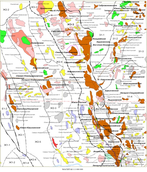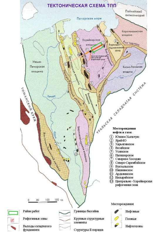 По поверхности фундамента и нижнепалеозойским отложениям район работ находится в пределах Печоро-Колвинского авлакогена, который представляет собой наиболее прогнутую зону Печорской синеклизы. Поверхность фундамента расчленяется на отдельные глубокие котловины (в т.ч. Харьягинскую), разделенные приподнятыми блоками.