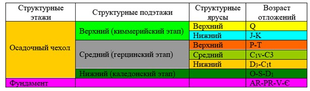 Формирование структуры верхнего структурного этажа сопровождалось последовательной сменой тектонических режимов, отмечавшейся в разрезе осадочного чехла структурными ярусами и разделяющими их угловыми и стратиграфическими несогласиями. В пределах верхнего структурного этажа Тимано-Печорской эпибайкальской плиты выделяются три структурных яруса: ордовикско-нижнедевонский; средне-девонско-триасовый и юрско-четвертичный, разделенные между собой региональными перерывами и соответствующие каледонскому, герцинскому и альпийскому этапам тектогенеза Уральской геосинклинали.