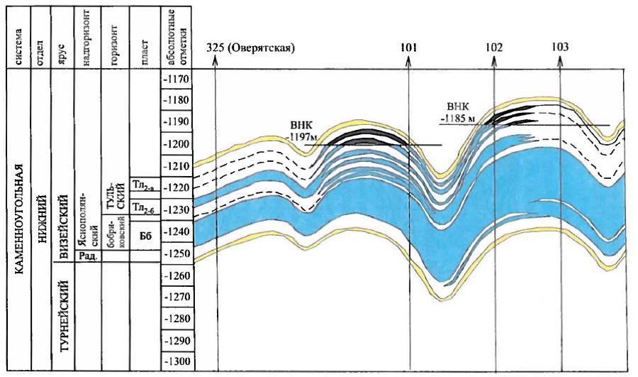 Рис.1. Схематический разрез пластов нижнекаменноугольных отложений по линии скважин 325-101-102-103