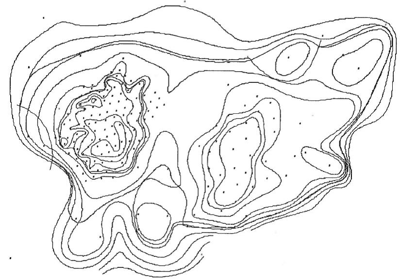 С 194 7 по 1952 гг. произведено разбуривание залежи Западного купола по треугольной сетке с расстоянием между скважинами 430 м. Всего было пробурено 110 скважин.