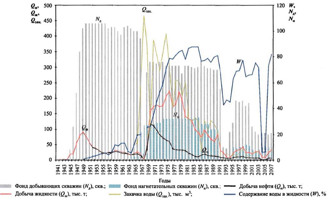 Верейско-башкирские залежи работали 26 лет на режиме растворенного газа, 27 лет на жестком водонапорном режиме (до 1993 г.). Наколенная добыча составила 1763,4 тыс. т, КИН - 0,082.