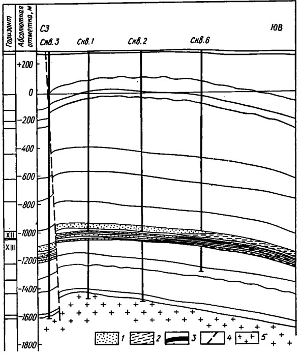 Рис.1 Геологический профиль месторождения Шуртепе. По Ю. М. Голосковову, 1961 г. 1 - газ; 2 - нефть ; 3 - вода; 4 - разрывные нарушения; 5 - породы фундамента
