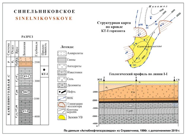 Фактически месторождение Синельниковское можно рассматривать как участок месторождения Жанажол. Продуктивна верхняя часть региональной нефтегазоносной толщи KT-I, в которой непосредственно в кровельной части известняков под терригенной и соленосной покрышкой ранней перми разведан нефтяной горизонт.