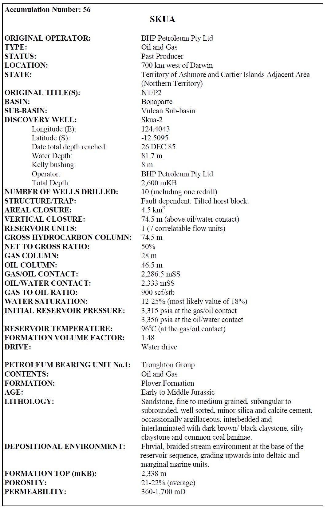 The Skua field covers an area of approximately 4.5 square kilometers and is interpreted to have a 28 metre gas cap and a 46.5 metre oil leg (Osborne, 1990).