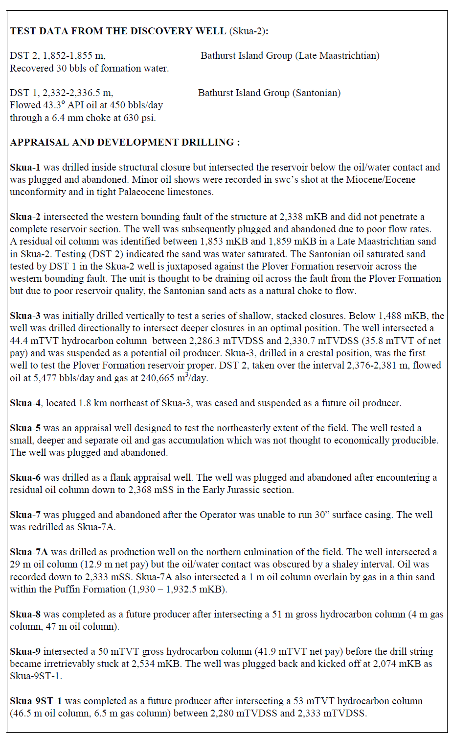 A follow up well (Skua-2) intersected the western bounding fault of the structure and did not penetrate a complete reservoir section. Oil was recovered on test from a Santonian age sand. This sand is juxtaposed against the Plover Formation reservoir across the western bounding fault of the Skua structure. The unit is thought to be draining oil across the fault from the Plover Formation but due to poor reservoir quality, the Santonian sand acts as a natural choke to flow. The well was subsequently plugged and abandoned due to poor flow rates (Osborne, 1990).
