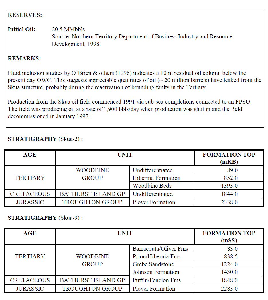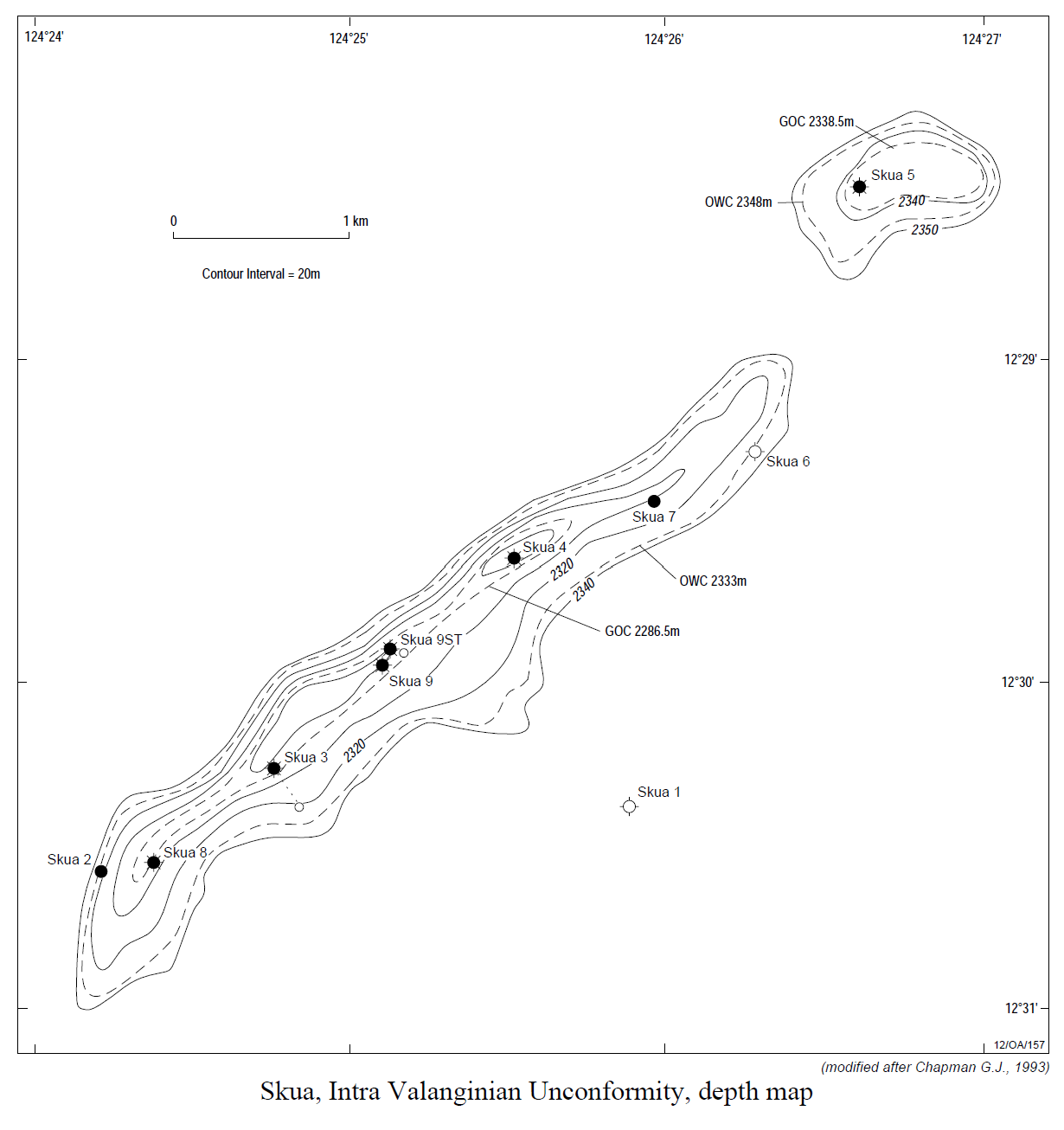 A further 8 appraisal / development wells were drilled on Skua. Seven reservoir units are recognized in the field - all are Early to Middle Jurassic, Plover Formation sands. These units sub-crop the Callovian Unconformity and are sealed by basal claystones and marls of the Bathurst Island Group.