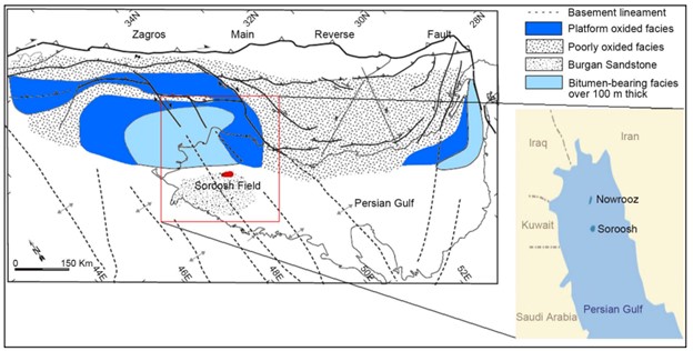 The Soroosh field is located about 80 km west of Kharg Island, in which oil is mainly produced from the Albian Burgan Formation. This formation shows various thicknesses in different parts of the Arabian plate. Its maximum thickness is about 390 m in the east of Kuwait. The studied units are equivalent to lower part of the Kazhdumi Formation in northwest of the Persian Gulf and upper part of Burgan in northern Kuwait. The studied formation (known as Burgan Formation here) is mainly composed of sandstone and shale. The organic matter in the shaley facies is considered terrestrial in origin and related to a coaly environment. Results from rock-eval studies have shown that the shale facies are not reach to the onset of oil generation. The bitumen-bearing facies is generally confined in the Dezful Embayment by a network of basement faults and partly along the Oman fault, south of Bandar Abbas.