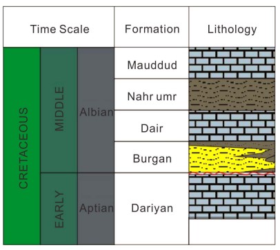 The Burgan Formation occurs on top of the Dariyan (Shuaiba) Formation in the studied area, where is overlain by Dair Formation. Al-Fares et al., 1998 reported the existence of a major hiatus on tap of the Dariyan Formation (Figure 2). Studied formation (Burgan) in northwest of Persian Gulf is a distal equivalent of plant-bearing deltaic sandstones and shales of the Burgan Formation in Kuwait and the NahrUmr Formation in Iraq. In the studied field the Burgan Formation is placed on top of upper Shuaibaclastics. It has been well studied in oil fields of North West of the Persian Gulf, where is informally divided into two parts (Burgan A and B). The Burgan Ain upper part of the formation is dominated by shale and consolidated sandstone. The Burgan B (the reservoir unit) in the lower part of the formation is dominated by fluvial sandstone facies.