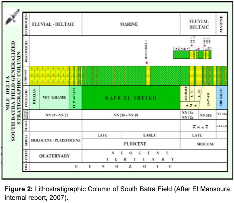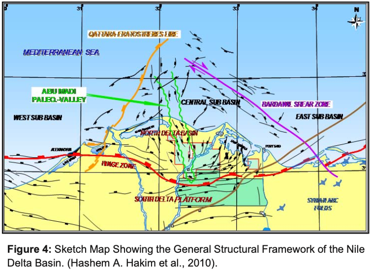 The depositional history of the Nile Delta basin has been influenced by multiple tectonic events and the Mediterranean sea- level fluctuations, which have both controlled sediment supply to the basin and accumulation space. Because of the Jurassic to Early Cretaceous, Tethyan rifting and the opening of Mediterranean, mixed clastic and carbonate shelf edges aggraded vertically along a steep fault-bounded shelf-slope break during the Cretaceous. The “hinge line” in Northern Egypt exerts the fundamental control on reservoir distribution in Tertiary age strata. The Tethyan rift margin was transpressionally inverted during the Syrian Arc Orogeny. The “hinge line” in Northern Egypt exerts the fundamental control on reservoir distribution in Tertiary age strata. The Tethyan rift margin was transpressionally inverted during the Syrian Arc Orogeny.