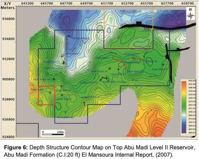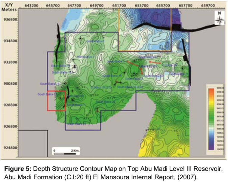 From the Oligocene to Recent, the Nile Delta has been the site of rapid accumulation of clastic sediment derived from a southward direction drainage system on the Afro-Arabian platform. The result is a 15,000 ft) thick wedge of the clastic sediments prograding northwards from the platform edge. The depth structure contour maps of Abu Madi level III reservoir, noticed gentle dipping towards the north direction. There is the E-W major fault parallel to the Hinge Line, throwing down to the north which is affected on this level with some minor faults in N-S direction (Baltim trend) that throwing down to the west. These faults created a four way dip closures of Abu Madi level III reservoir which had a geometric shape trending E-W and NE-SW directions. The highest depths for Top Abu Madi Level III within the study area in the eastern part of the S. Batra field are occurred at the central part (in S.Batra-1, S.Batra-14 and S. Batra-24) while the lowering in the depths towards the eastern part ( in S.Batra-2 and S.Batra-24). While the depth structure contour maps of Top Abu Madi Level II reservoir, showed that, there is a gentle dipping toward the north and the E-W major fault still affected on Top Abu Madi Level II with some minor faults in N-S and E-W directions on the eastern side of the field. Some small closures are existed where the drilled wells are penetrated; also we note that the channel trends of Abu Madi Level II in NE-SW direction as in Level III (Figure 6). From the above mentioned depth structure contour maps (Figure 5 & 6) the studied area is tectonically affected by a major deep-seated fault which is running in E-W direction, parallel to the hinge zone. This fault has affected the rock units form Oligocene to Intra Kafr El Sheikh Formation. This fault has made the northern part of South Batra area in the upthrown side of the fault, which gives a great possibility of hydrocarbon migration to this part, which is feeding the Abu Madi Reservoirs from the East Delta Field in the north, which is vertically sealed by the big thickness of Kafr El Sheikh Formation.