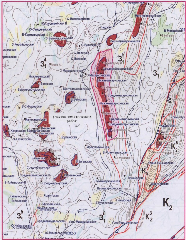 В региональном тектоническом плане район Среднемакарихинского нефтяного месторождения распологается в пределах Макариха-Салюкинской антиклинальной зоны, входящей в состав Хорейверской впадины Тимано-Печорской нефтегазоносной провинции. По поверхности фундамента Хорейверской впадине соответствует погребенный Большеземельский свод (рис.1).