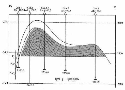Залежь нефти в нижнепермских карбонатных отложениях сводовая, массивная, приурочена к поровым и каверново-поровым известнякам ас- сельского и сакмарского ярусов нижней перми. Размеры залежи составляют 13,7x1,4 км, высота - 81 м, глубина залегания - 2432 м (рис. 1,2).