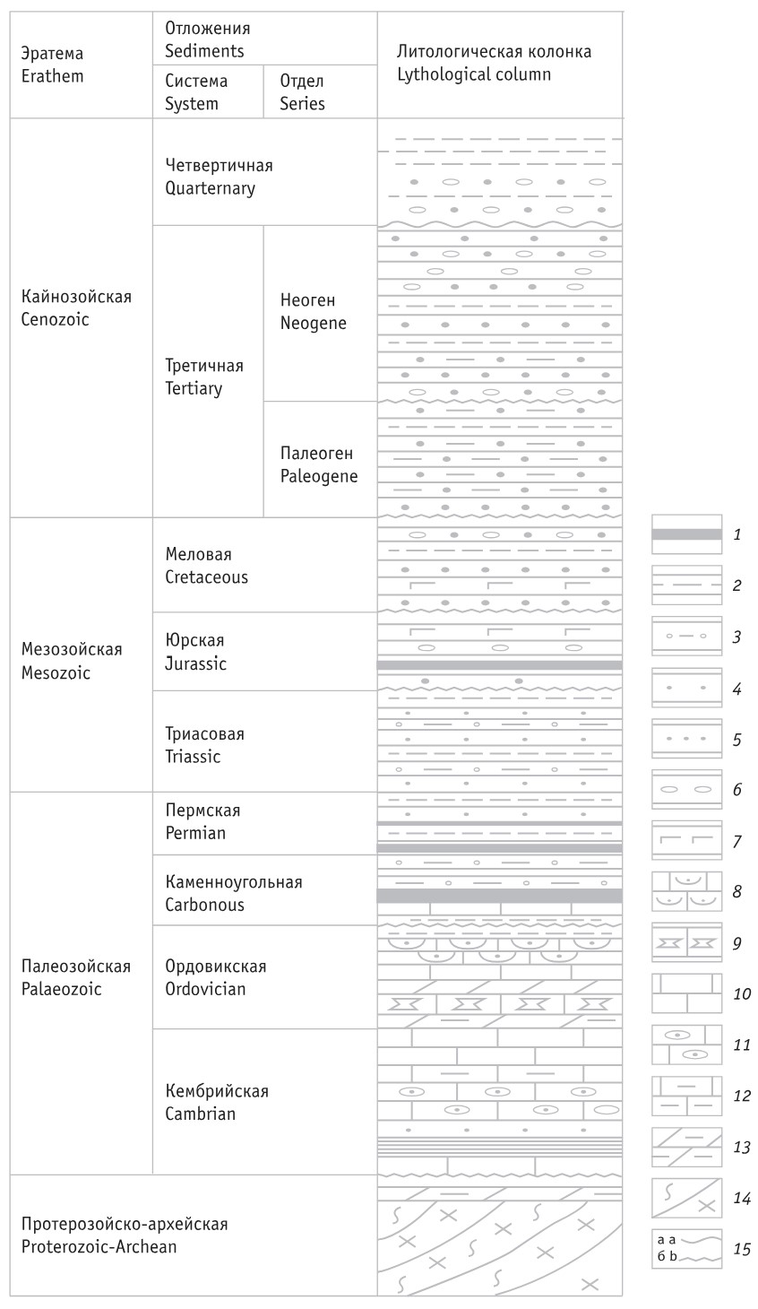 Рис. 1. Стратиграфия и литологический состав бассейна Ордос: 1 – угольный пласт; 2 – пелиты; 3 – алевролиты; 4 – песчаники; 5 – гриты; 6 – конгломераты; 7 – вулканические туфы; 8 – биокластические известняки; 9 – гипсовые соли; 10 – известняки; 11 – оолитовые известняки; 12 – мергели; 13 – глинистые доломиты; 14 – метаморфические породы; 15 – несогласие: а) межформационное; б) внутриформационное