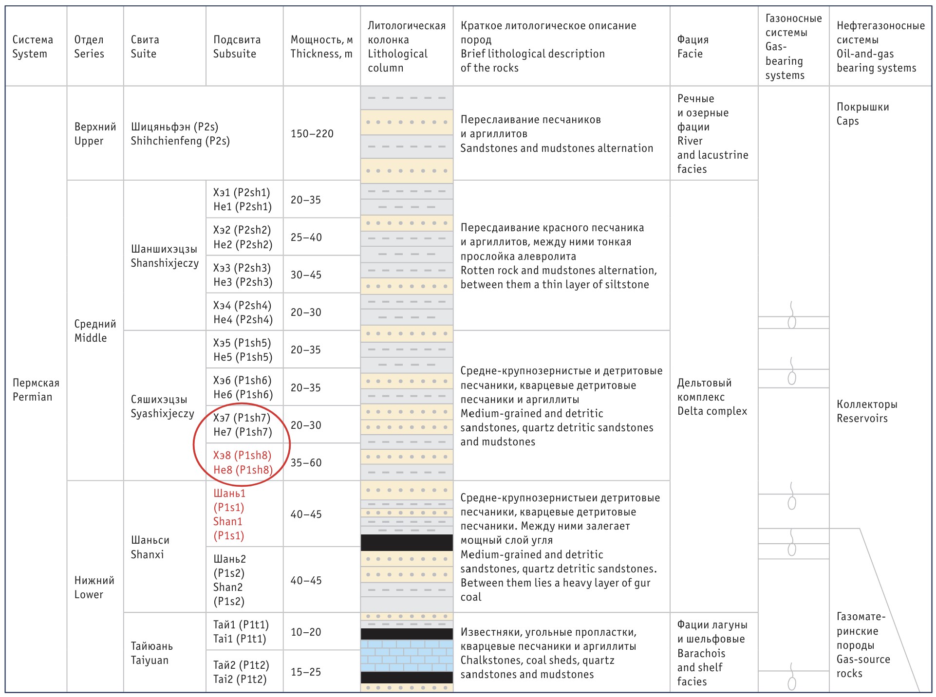 Основные газосодержащие толщи относятся к средне- и нижнепермским отделам. Пермские отложения, состоящие в основном из континентальных переходных кластических и угольных пород, широко представлены в бассейне. Общая мощность пермской системы достигает 610–980м. Система включает горизонты Тайюань, Шаньси, Сяшихэцзы, Шаншихэцзы и Шицяньфэн (рис. 2). Горизонты Шаньси Шань1 (P1s1) и Сяшихэцзы Хэ8 (P1sh8) являются основными газоносными. Они представлены в основном речными отложениями – мелко- и среднезернистыми детритовыми и кварцевыми детритовыми песчаниками.
