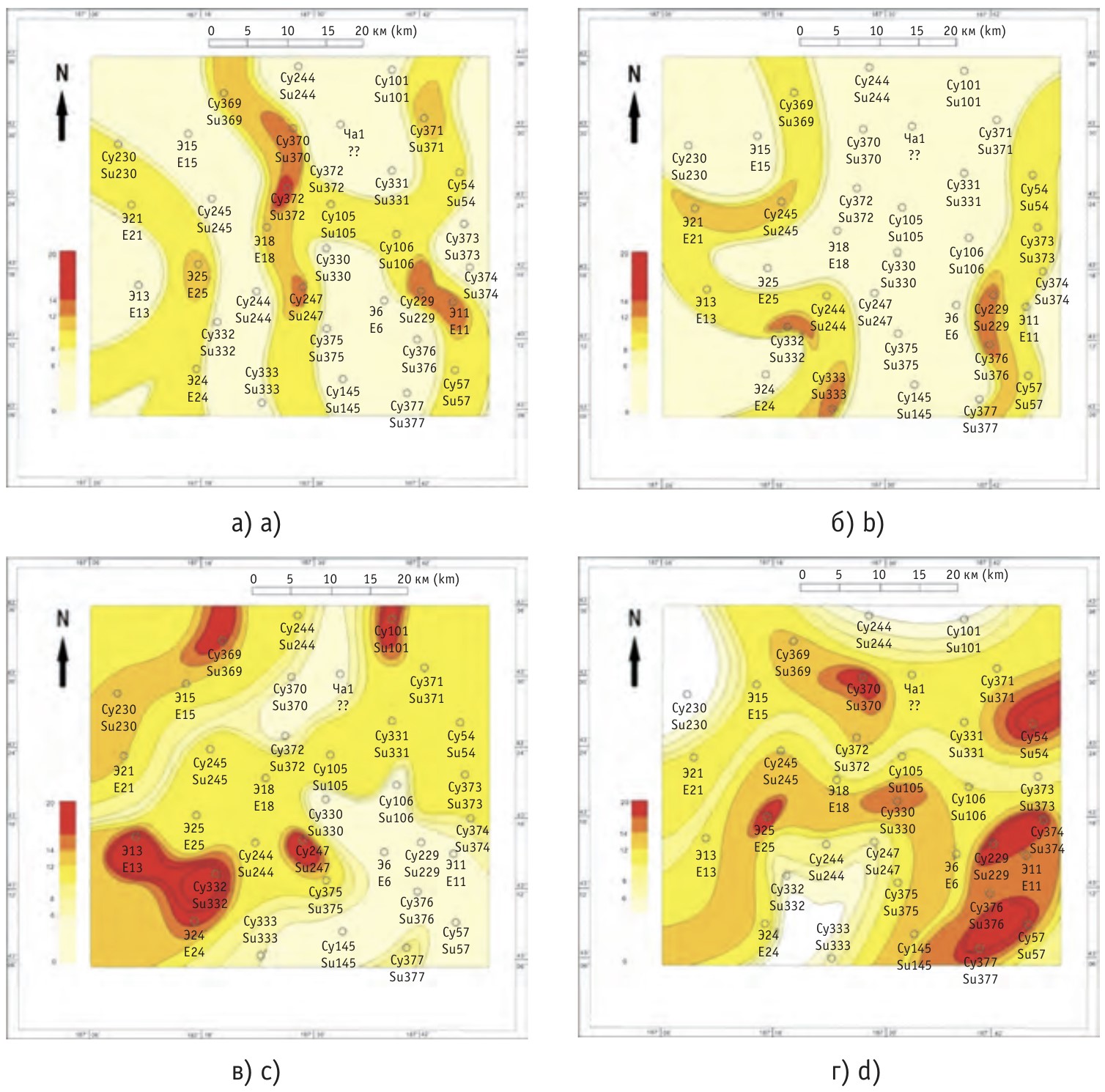 Рис. 3. Мощность песчаников горизонтов: а) h8s1; б) h8s2; в) h8x1; г) h8x2
