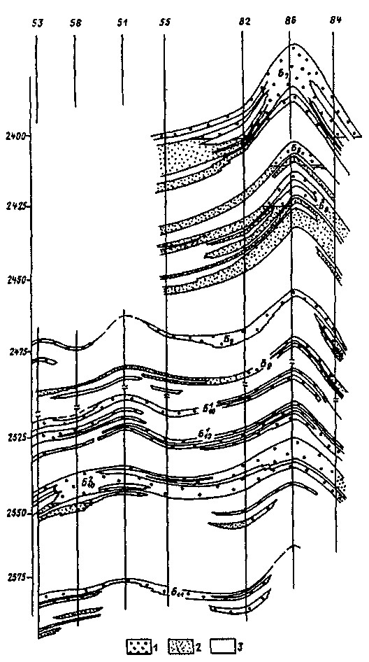 Рис. 1. Суторминское газонефтяное месторождение. Геологический профиль продуктивных пластов БС7-БС11: 1,2 — нефте-, водонасыщенный песчаник; 3 — глина