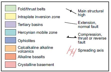 Figure 1: Generalised tectonic map of the Arabian Platform (Konert et al., 2001). The Souedih Oilfield is located at 37˚N and 42˚E.
