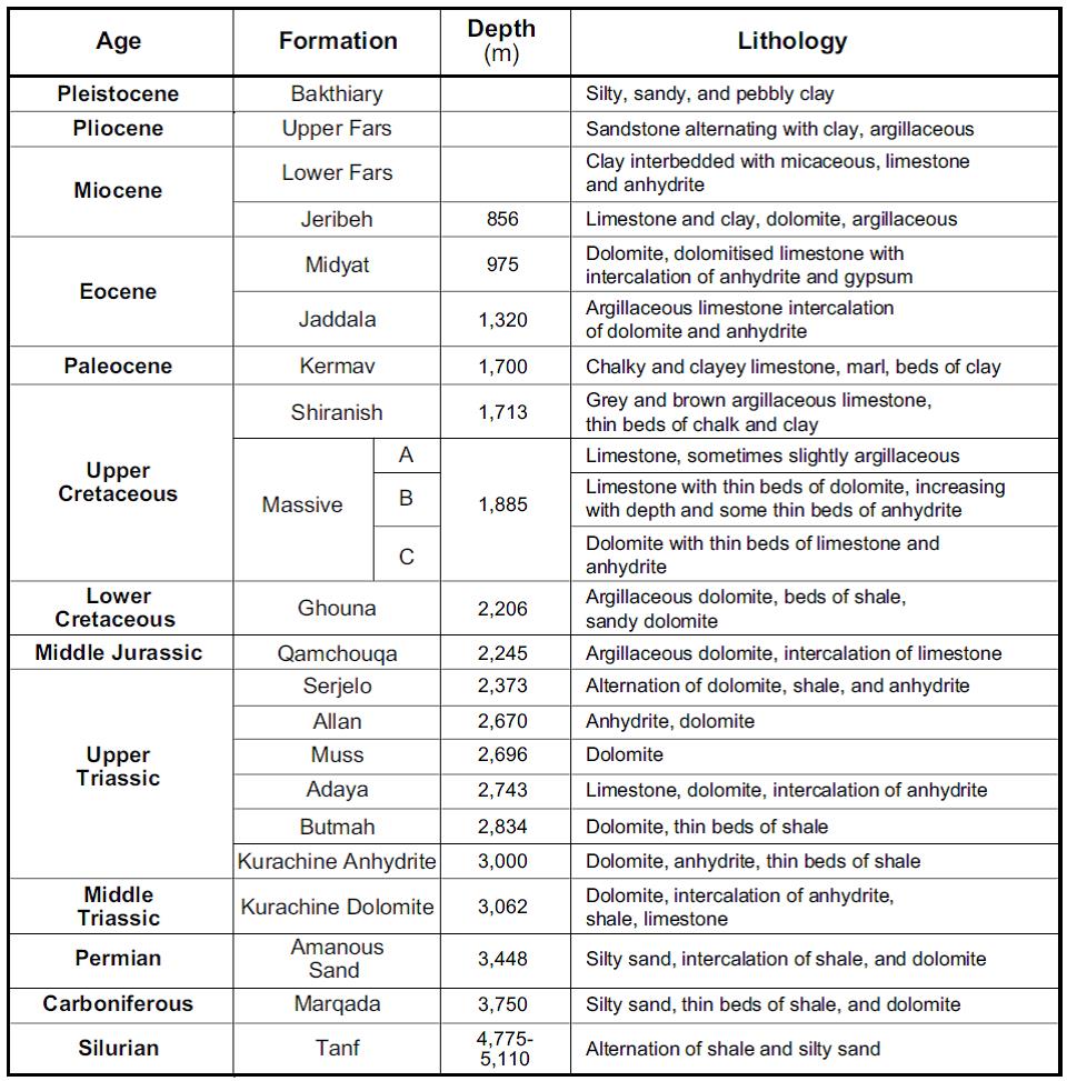 The thick Mesozoic series are dominated by carbonate rocks – limestone and dolomite, which are more-or-less argillaceous. Anhydrite and shale become more common in the Triassic. The Massive Formation (Albian–Lower Campanian) consists entirely of carbonate rocks and is considered the main productive formation in the region in general, and in the Souedih Field in particular. It is unconformably overlain by the Shiranish Formation (Upper Campanian–Maastrichtian), and unconformably overlies the Rutbah (Barremian–Aptian) or Qamchouqa (Middle Jurassic) formations.