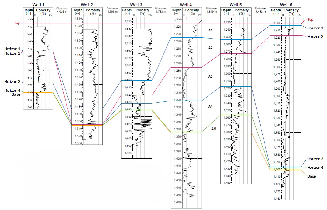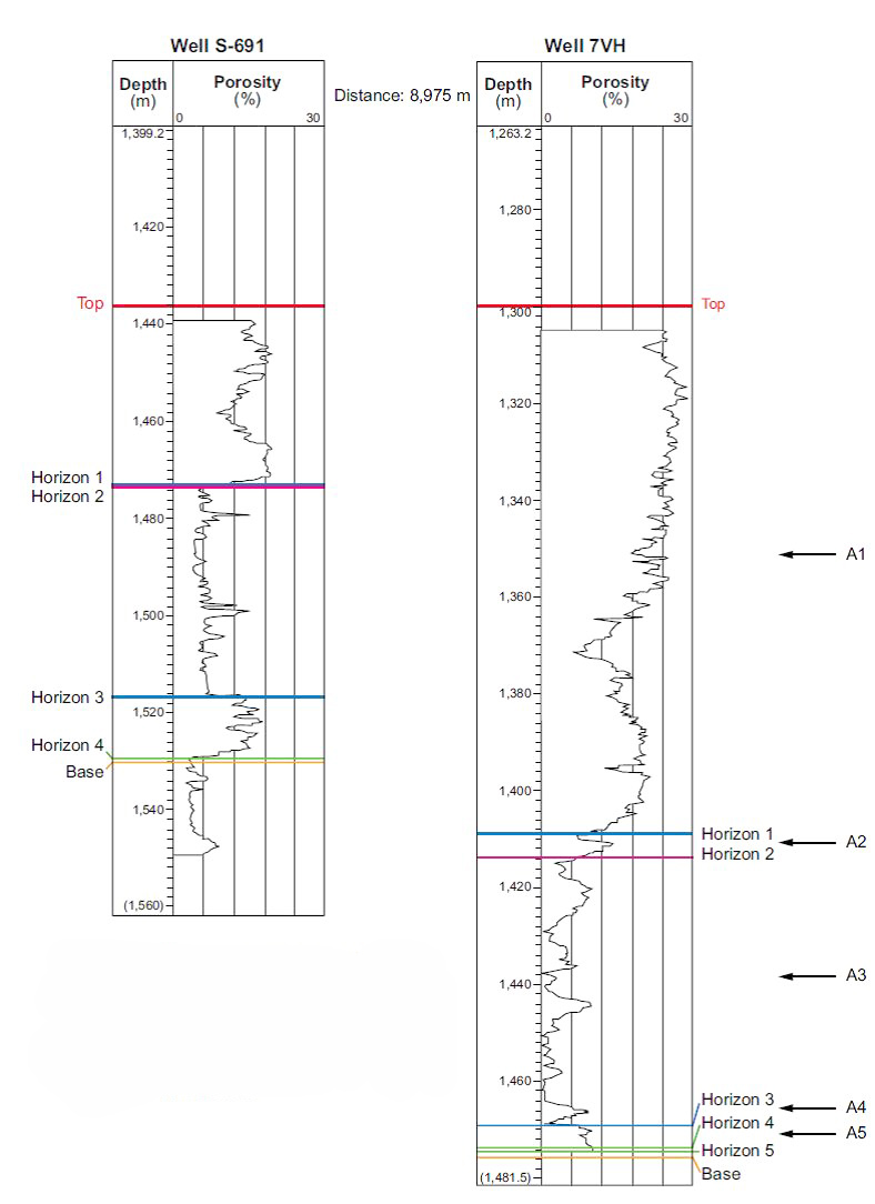 Zone A4 extends between horizons 3 and 4, with average porosity values mostly in excess of 10%. However, it has some thin intervals (2–4 m thick), in which porosity values exceed 20%, and other intervals with values less than 5%. This zone is absent in most of the western and extreme eastern wells, but its thickness may exceed 40 m in some of the transition region wells (e.g. Well 4).