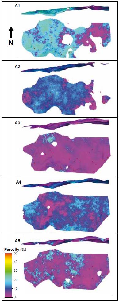 With regard to vertical variation in porosity, we recognise the existence of five zones, which themselves show regional variations in thickness (Figure 4). The regional model for the distribution of porosity is constructed for each zone and shown in Figure 6.