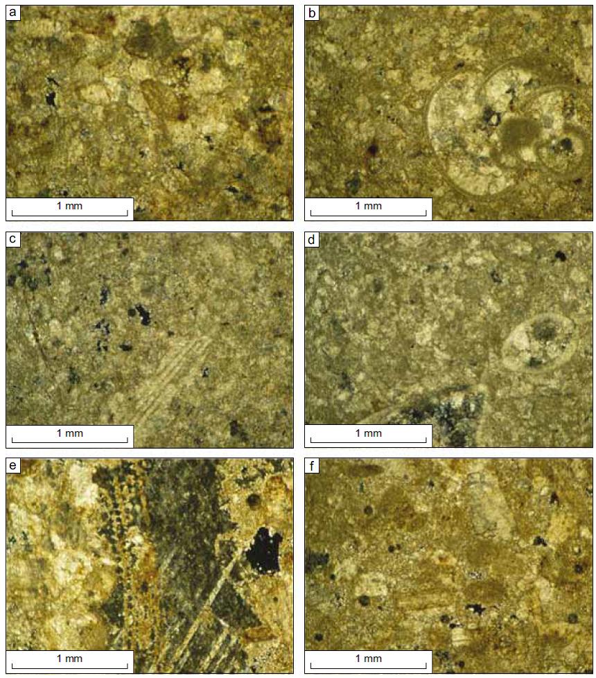 The dominant bioclasts consist mainly of bivalves (shallow water types), molluscs, echinoderm plates, benthic foraminiferans (particularly orbitoids and miliolinids), and ostracods. In some thin sections we observe planktonic foraminiferans inside benthic species. The bioclasts appear abraded, and moderately to well sorted. Most samples contain some large, dispersed, cloudy crystals of diagenetic dolomite (not exceeding 10–20%). Other mineral grains encountered in some thin sections are small scattered pyrite crystals, greenish-coloured glauconite grains, and small fragments of phosphate and chert. In some samples there are bitumen spots and impregnations.