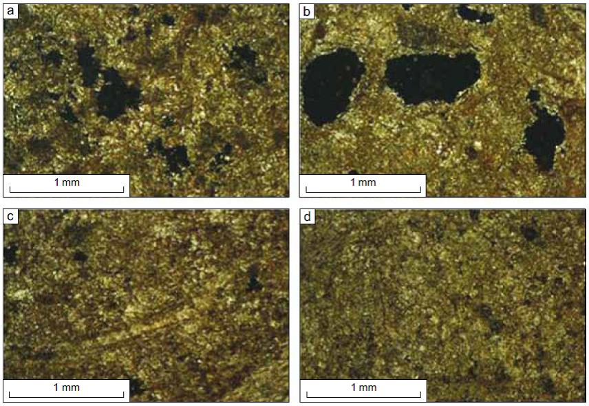 By far the dominant and in many cases the only porosity observed is mouldic porosity, from both zones (A1 and A3) (Figure 9). In a few samples there is also some channel porosity and micro-fracture porosity. Overall the relative abundance and size of the mouldic pore spaces in the thin sections taken from Zone A1 are clearly greater than those taken from Zone A3. It is possible that the increased amount of sparitic cement in certain parts, for example Zone A3, have infilled preexisting mouldic porosity. However, the alternative interpretation that the sparite came first and has not been fully removed by secondary dissolution cannot be ruled out. Further work is required.