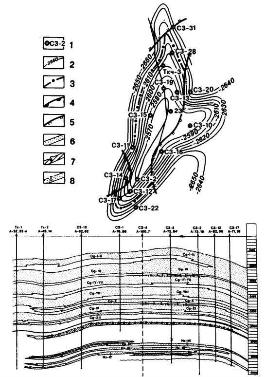 Рис. 1 Сузунское месторождение А - структурная карта, Б - геологический разрез; 1 - скважины, вскрывшие кровлю нижнехетской свиты, 2 - изогипсы крот ли нижнехетской свиты, 3 - контур и линия (на разрезе) водонефгяного контакта, 4 - контур газонефтяного контакта. 5 - линия глинизации пласта НХ-1, 6 - песчаные пласты, 7 - нефтяная залежь, 8 - газовая залежь