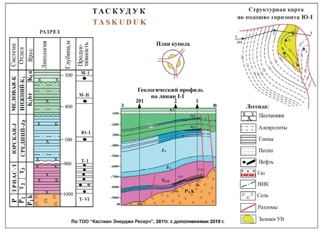 Газонефтяное месторождение Таскудук находится на юго-западе Восточно-Прикаспийской НГО. В структурном отношении оно приурочено к соляному куполу сложной конфигурации, соединяющемуся соляными перешейками с куполам Таскудук Западный,Левите и лругими. В соответствии с морфологией соляного тела в надсолевом комплексе отложений выделяются южное (Основной свод), западное и восточное крылья. Все они вмещают продуктивные горизонты. На Основном своде разведаны меловые, юрские и триасовые залежи. На остальных крыльях продуктивны только триасовые резервуары.