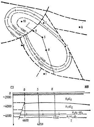 Месторождение открыто в 1977 г. скв. 3. При опробовании кровельной части отложений неоком-апта из интервала 4431-4438 м получен приток газа с конденсатом. Дебит газа соста¬вил 71 тыс., конденсата 78 м3/сут. Залежь пластовая, сводовая, залегающая на глубинах 4429-4470 м. Пластовое давление в ней равно 42,17 МПа и ниже гидростатического, в отличие от вышезалегающих коллекторов альба, пластовые давления в которых выше гидростатических.