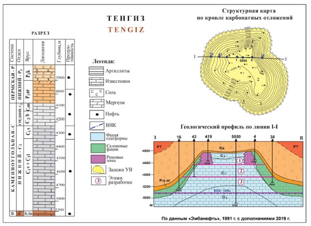Нефтяное месторождение Тенгиз находится на восточном побережье Каспийского моря, в центре Приморского свода. В структурном отношении месторождение приурочено к крупному карбонатному массиву в подсолевом комплексе отложений, перекрытому мощной соленосной покрышкой. Такое весьма благоприятное сочетание седиментационных и структурных предпосылок обусловило формирование гигантского месторождения углеводородов.