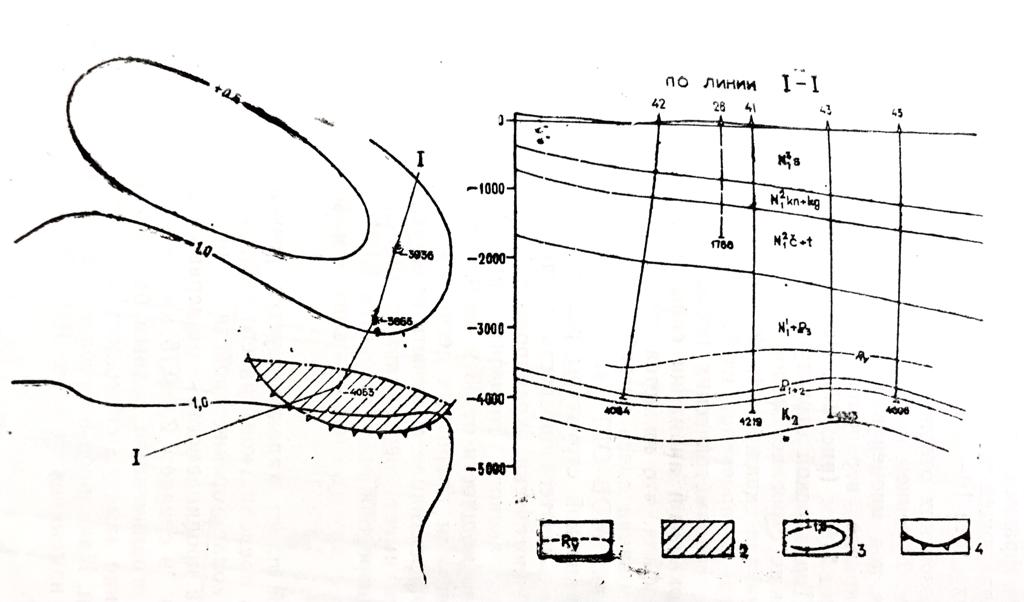 В 1971 г. на Тернаирской площади вновь возобновились геологоразведочные работы с целью поисков нефти и газа в верхнемеловых отложениях. На первом этапе был заложен профиль из трех скважин 41, 42, 43 для изучения соотношения структурных планов миоценовых слоев с верхнемеловыми отложениями и оценки их нефтегазоносности. В результате бурения удалось установить, что при общем региональном погружении миоценового комплекса к северу верхнемеловые отложения воздымаются в этом же направлении (рис. 1). В результате бурения были получены отрицательные показатели.