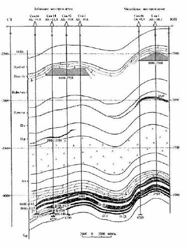 Рис. 1. Тобойское и Мядсейское нефтяные месторождения. Геологический разрез продуктивных девонских отложений по линии I-I (Пилосова и др., 1996 г.).