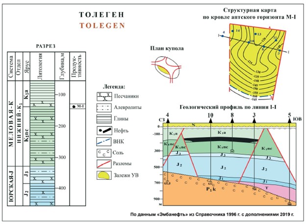 Нефтяное месторождение Толеген находится в центральной зоне Южно-Эмбинской НГО, непосредственно к югу от Доссора. В структурном отношении месторождение приурочено к сложному по конфигурации соляному куполу. На южном крыле, интенсивно разбитом на отдельные блоки, выявлена нижнемеловая залежь нефти.