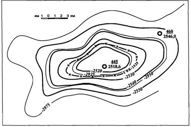 Рис.1. Трехбугорное месторождение. Структурная карта по кровле пласта ТП21 и по кровле отражающего горизонта В1 (по данным ГГП «Ямалнефтегазгеология», 1993 г.)