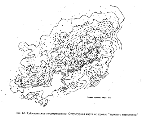 Туймазинское месторождение было первым месторождением "платформенного" типа, открытым в России. Как известно, этот тип отличается обширными размерами и, как правило, приурочено к пологим обычно брахиантиклинальным структурам с углами падения крыльев не более единиц градусов. Оно также приурочено к брахиантиклинали с пологим северо-западным (угол падения до 30°), и более крутым юго-восточным крылом (3-4°) (рис. 67).