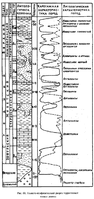 Девонская терригенная толща залегает в основании осадочного чехла либо на кристаллическом фундаменте, либо на вендских отложениях. Общая мощность этой основной продуктивной толщи достигает 156 м, в которой выделяются пять пачек песчаников – ДI, ДII, ДIII, ДIV и ДV (сверху вниз) (рис. 68).
