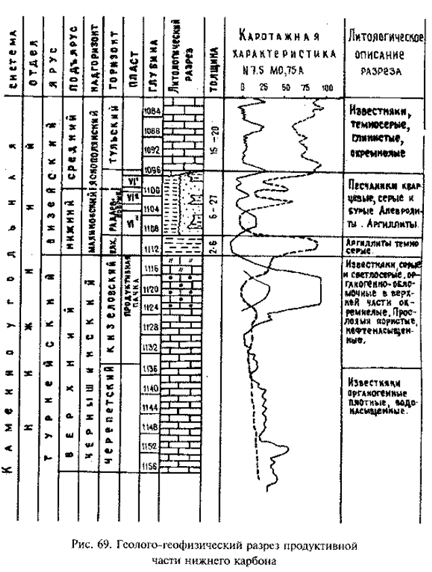 K верхней части турнейского яруса приурочена промышленная нефтеносность практически на всей площади месторождения. Коллекторами являются пористые известняки мощностью до 12 м. На эти известняки налегает пачка терригенных пород визейского яруса нижнего карбона (бобриковский горизонт). Сложен горизонт аргиллитами, алевролитами и песчаниками. Выделяются три песчаных пласта: VI-1, VI-2 и VI-3 (рис. 69). Развиты они пятнами, выклиниваются и замещаются на небольших расстояниях, мощность достигает 20 м и более. На отдельных участках они сливаются между собой. Отложения бобриковского горизонта являются по величине запасов третьим объектом разработки.