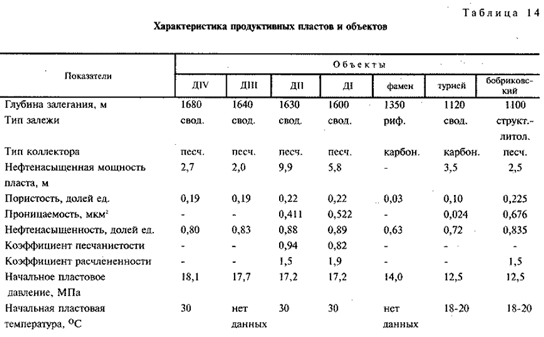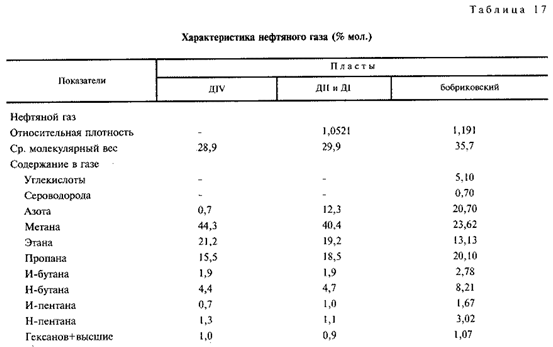 Нефти девонских горизонтов схожи между собой и в пластовых условиях характеризуются следующими свойствами: плотность 0,803 г/см3, вязкость при пластовой температуре (30-400C) и давлении насыщения в горизонте ДI - 2,28-2,59, ДII - 2,54-2,78 и ДIV -3,05 мПа*с.