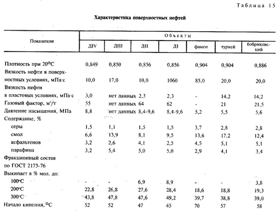 Проницаемость песчаников в среднем по толще 0,676 мкм2. При пористости менее 13% песчаники не являются коллекторами. Нефтенасыщенность песчаников в среднем 0,84. Характеристика нефтей представлена в табл. 15.