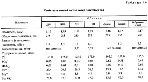Пластовые воды продуктивных горизонтов представляют собой метаморфизированные рассолы хлоркальциевого типа (табл.16). Общая минерализация в нижнем карбоне достигает 250, в девоне - до 280 г/л. Соли в растворе представлены практически только хлоридами, с преобладанием хлорида натрия. Воды горизонтов ДI и ДII практически идентичные. Содержание хлорида натрия составляет 62-65%. Содержание попутных микрокомпонентов составляет: калия - до 1,5 г/л, йода - до 4, аммония - 160-170, бария - до 100, стронция - 100-500 мг/л; особенно высоко содержание в девонской воде брома - до 1,2 г/л.