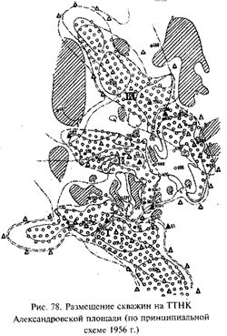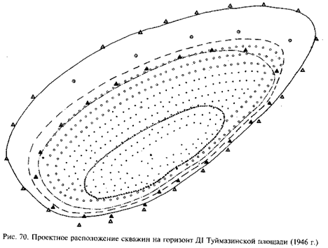 В процессе реализации этих решений выяснилось, что первые представления о геологическом строении месторождения сильно отличаются от реальных. Прежде всего, площадь залежи в горизонте ДI оказалась вдвое больше, так как была открыта т. н. Александровская площадь, объединенная с основной Туймазинской единым контуром. Кроме того, значительно большей оказалась площадь водонефтяной части залежи на северо-западном крыле (рис. 71). Поэтому в 1950 г. принято решение о вводе в разработку Александровской площади. Расположение добывающих скважин (плотность разбуривания) выбрано аналогично с основной площадью (500х500 м).
