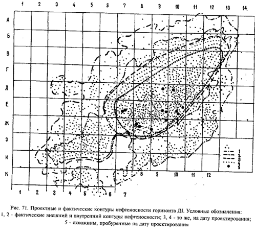 Залежь горизонта ДІ рекомендовалось разрабатывать только тремя батареями скважин с последующим возвратом скважин ДII, расположенных внутри этой сетки (рис. 70).